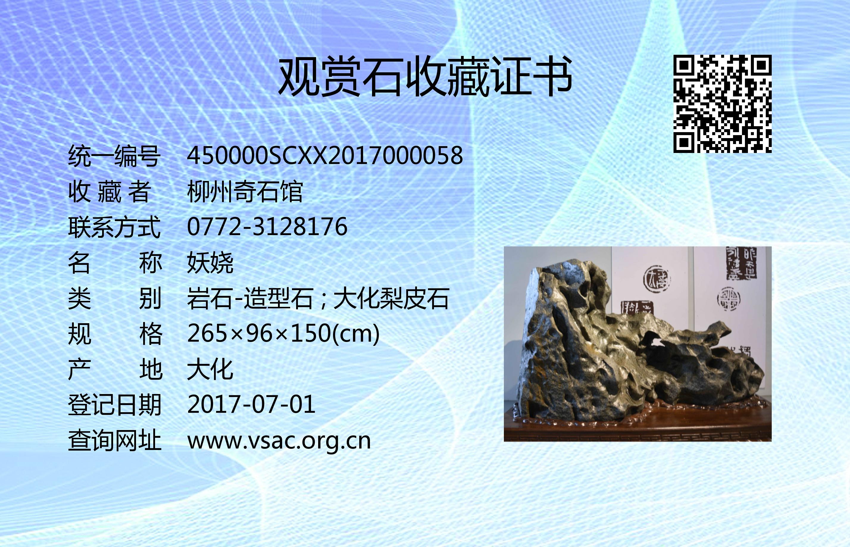 2016年11月30日,国石(北京)鉴定评估有限公司依据《观赏石鉴评》(GB/T31390-2015),鉴评结论为“特级”。