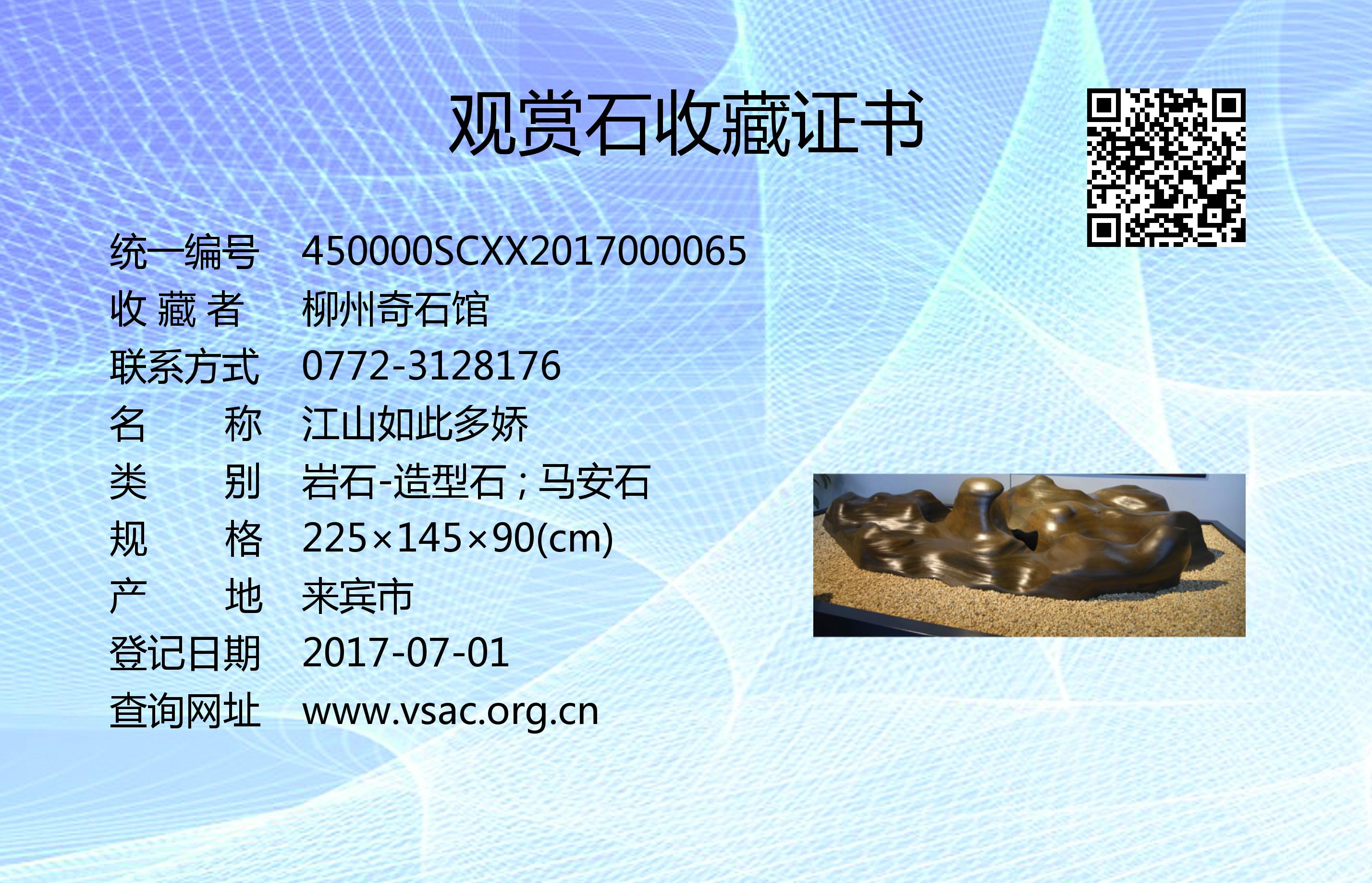 2016年11月30日,国石(北京)鉴定评估有限公司依据《观赏石鉴评》(GB/T31390-2015),鉴评结论为“特级”。