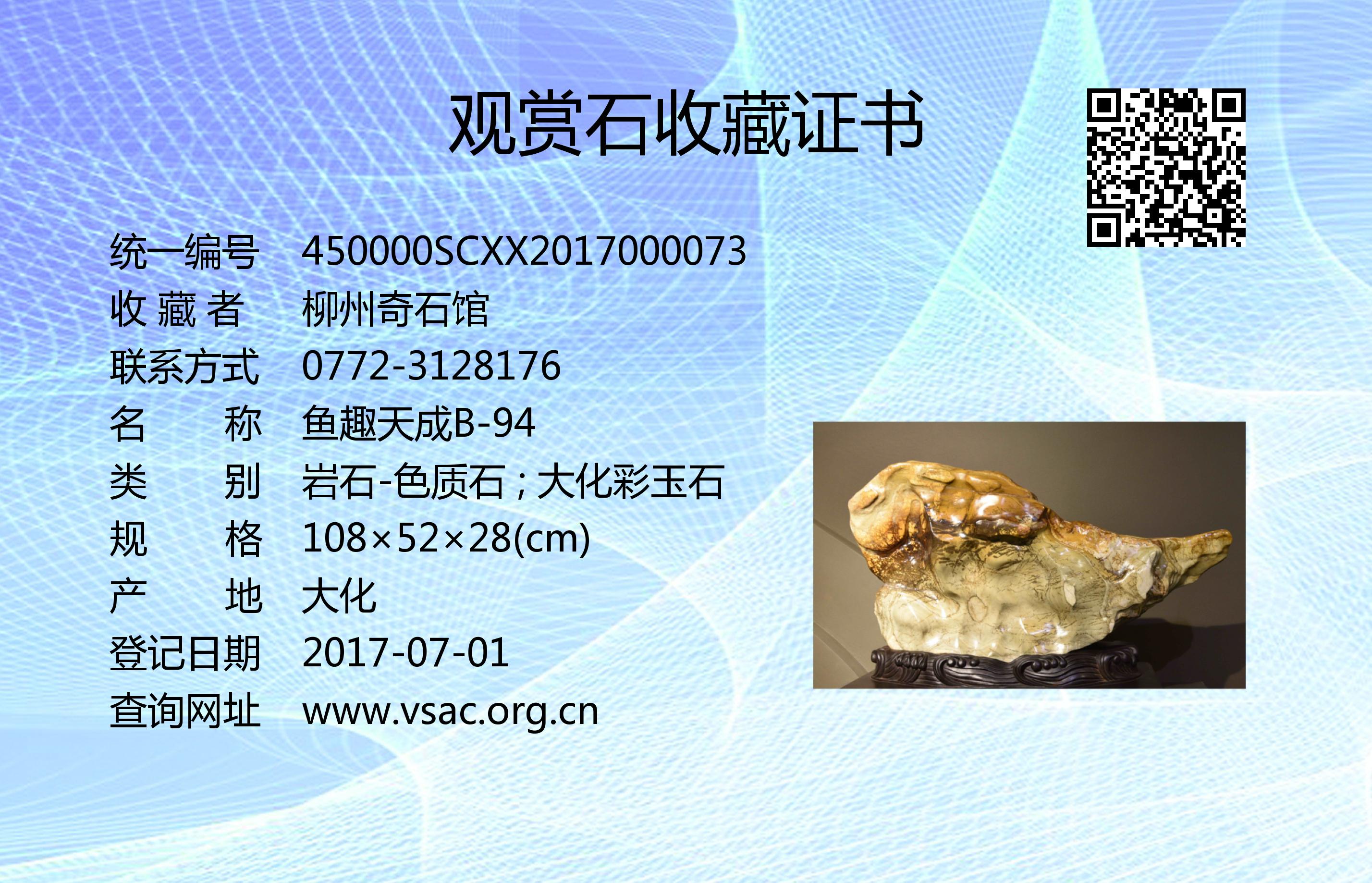 2016年11月30日,国石(北京)鉴定评估有限公司依据《观赏石鉴评》(GB/T31390-2015),鉴评结论为“特级”。