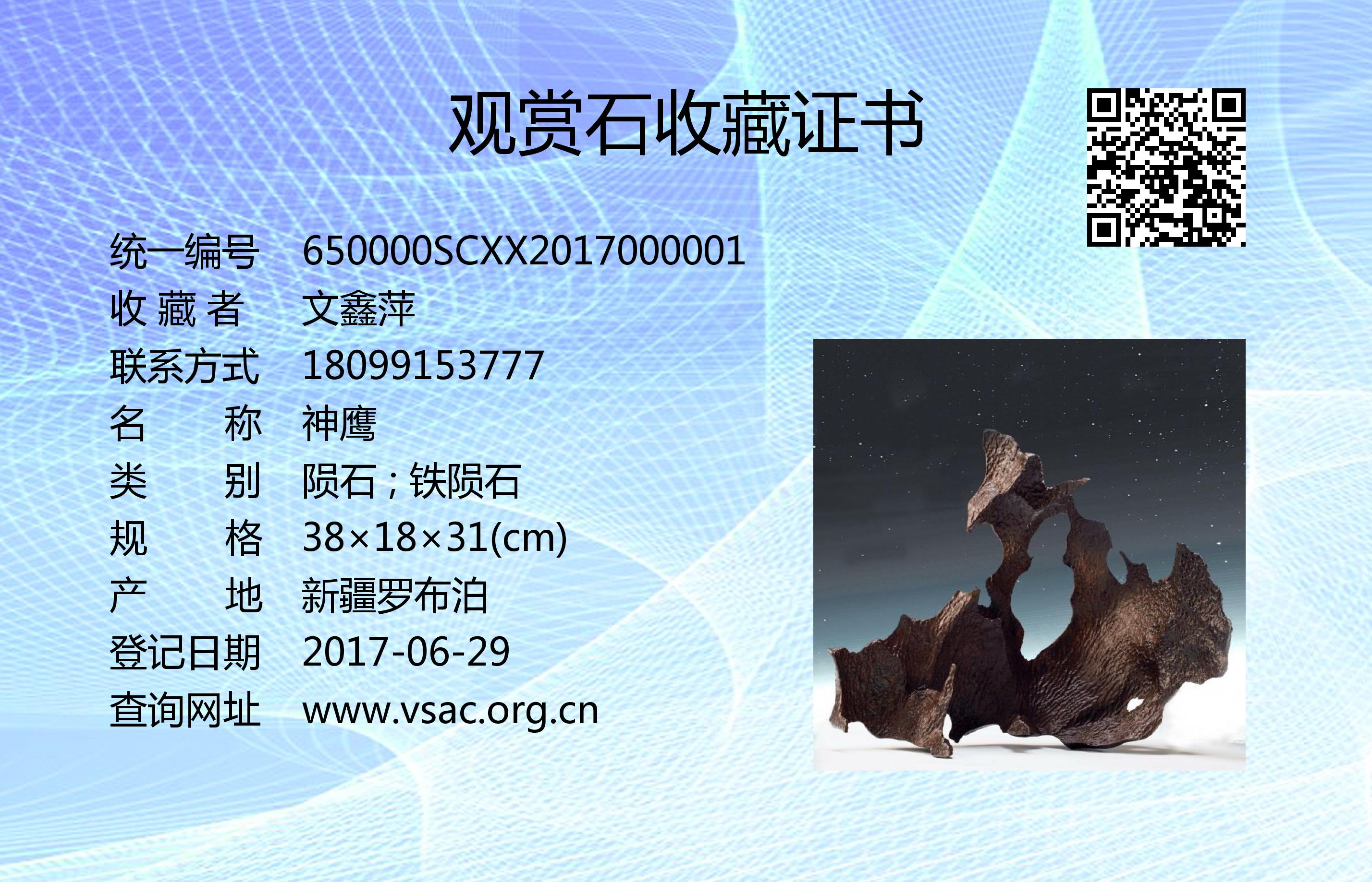 这颗发现于新疆罗布泊的“星星”陨石—神鹰—一经现世,就被国内顶级科学家欧阳自远院士高度认可。评价为世界上最美的星星,这颗陨石不仅外形出众。内在更有科研价值,且身份尊贵,同时占据了稀有性和唯一性,实属极品。神鹰—寓意着最真诚的吉祥,神鹰展翅。就仿佛这颗陨石是翱翔于宇宙之间的使者一样,对话宇宙,传递正能量。这颗陨石的出现,对于人类了解更深一层的宇宙以及进一步探索宇宙奥秘都有着重大的现实意义。